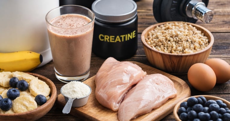 Proteínas: ajudam na construção muscular (frango, ovos, peixe)